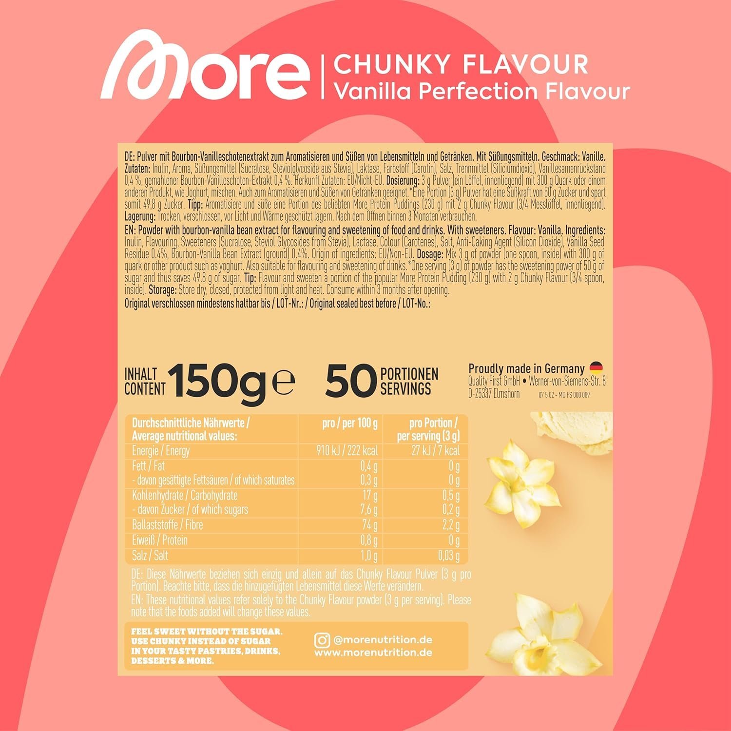 Ob im morgendlichen Kaffee, im Proteinshake, über frischem Obst oder in deinem Lieblingsdessert – das Aromapulver ist ein echter Allrounder. Es löst sich mühelos auf, egal ob in kalten oder heißen Speisen, und entfaltet dabei stets sein volles, rundes Süßearoma. So kannst du ganz einfach jeden Snack in einen genussvollen Moment verwandeln.